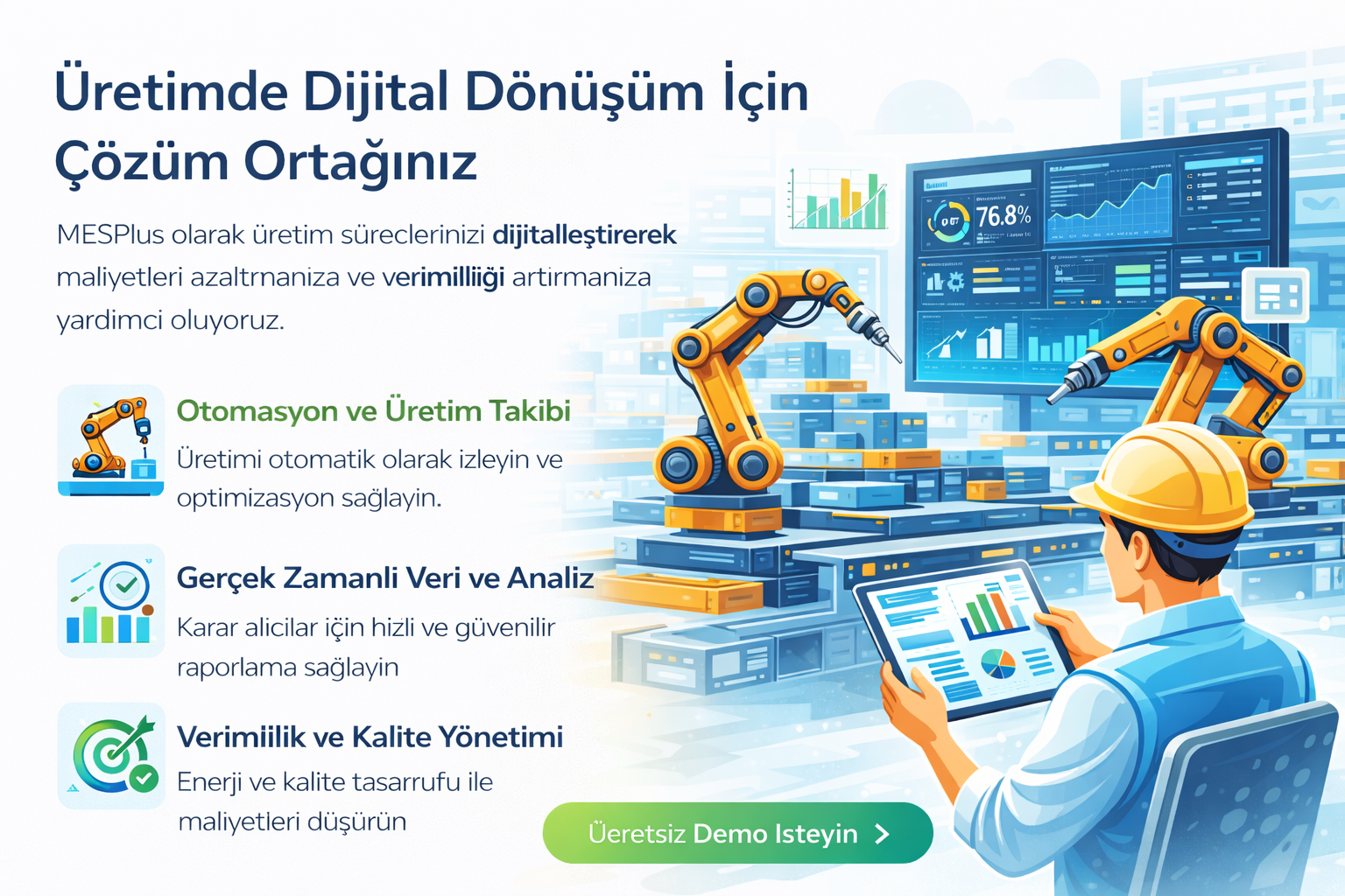 MESPlus ile işletmenizi Endüstri 4.0’a taşıyın. Gerçek zamanlı veri yönetimi, akıllı üretim çözümleri ve güvenli platformlarla daha verimli bir üretim süreci sağlayın.